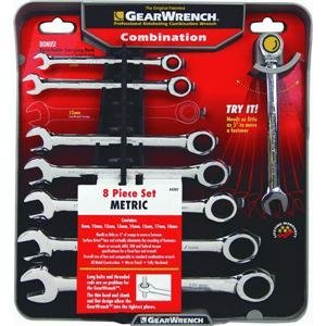 Gear Wrench, 8 Piece, Metric Ratcheting Wrench Set, Contains: 8, ten, twelve, 13, fourteen, fifteen, seventeen, eighteen Metric Wrenches.